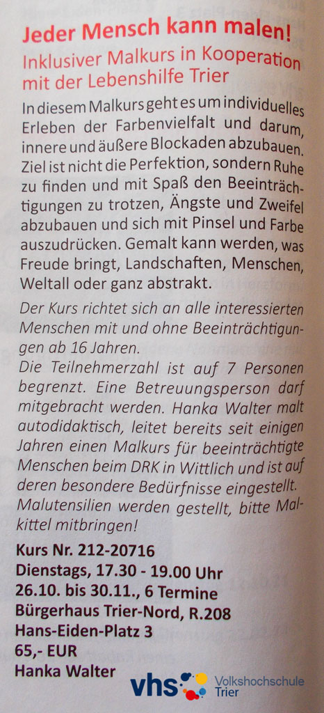 Ab Ende Oktober (26.10. bis 30.11. 2021) ist mein inklusiver Malkurs an der VHS Trier (Natürlich mit allen Vorsichtsmaßnahmen, um Corona zu trotzen.) geplant.