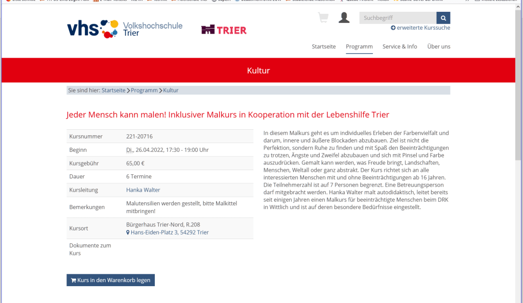 Ab Ende April (26.04. bis 31.05.2022) ist wieder mein inklusiver Malkurs an der VHS Trier (Natürlich mit allen Vorsichtsmaßnahmen, um Corona erneut zu trotzen.) geplant.